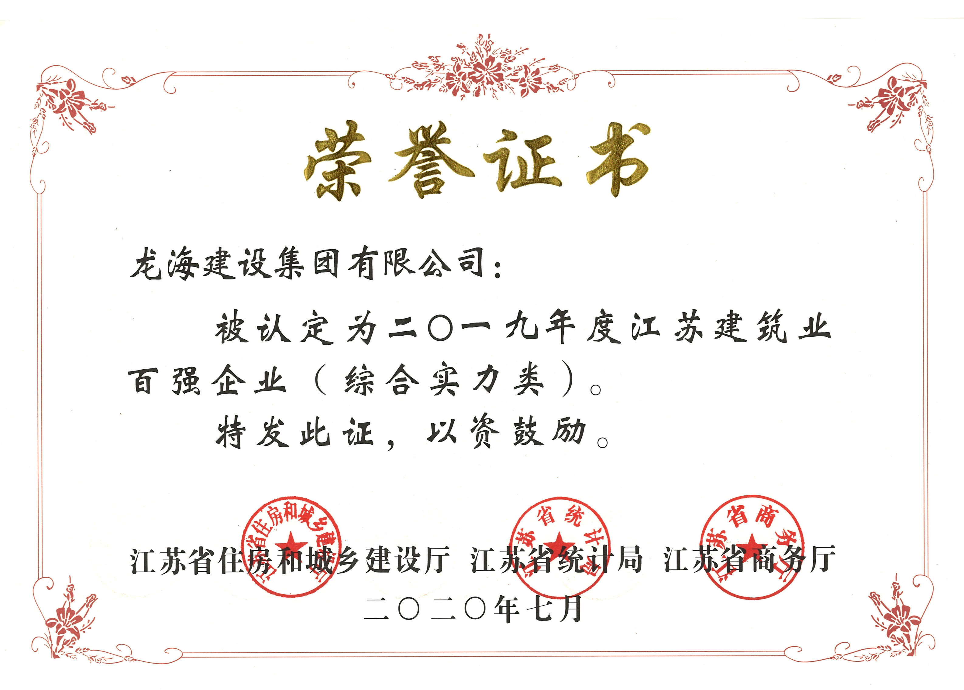 為表揚(yáng)先進(jìn),宣傳典型,進(jìn)一步激發(fā)和調(diào)動我省建筑業(yè)企業(yè)改革創(chuàng)新、轉(zhuǎn)型發(fā)展的積極性、主動性和創(chuàng)造性,擦亮“江蘇建造”高品質(zhì)發(fā)展品牌,省住建廳與省統(tǒng)計(jì)局、省商務(wù)廳聯(lián)合開展了2019年度建筑業(yè)“百強(qiáng)企業(yè)”認(rèn)定活動。經(jīng)評審,集團(tuán)公司脫穎而出,被授予“2019年度江蘇省建筑業(yè)百強(qiáng)企業(yè)(綜合實(shí)力類)”榮譽(yù)稱號,位列第三十位,公司已連續(xù)多年獲此殊榮。