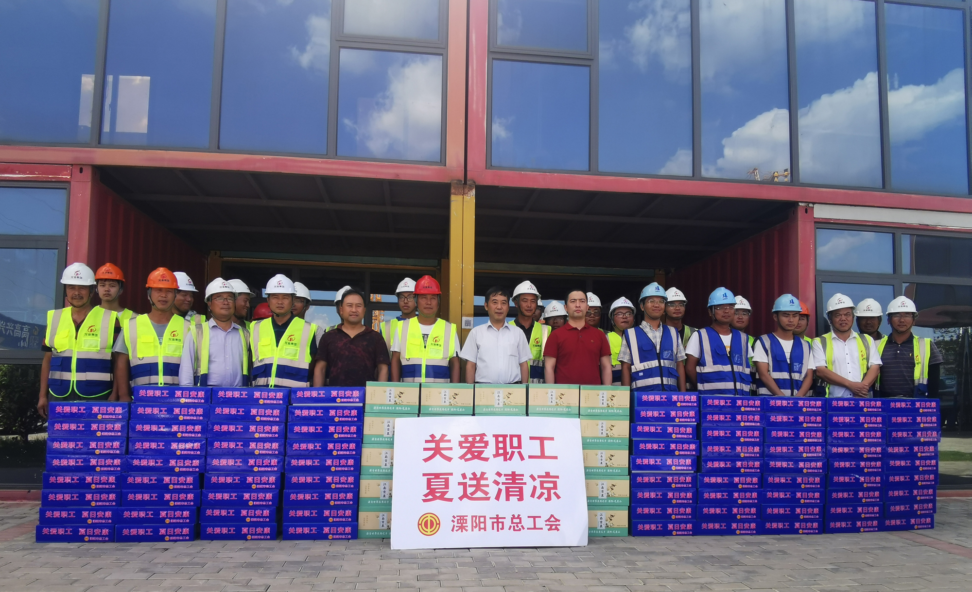 7月23日下午,正值盛夏時(shí)節(jié),酷暑當(dāng)頭,驕陽似火,溧陽市總工會萬如才主任、秦益明部長等一行數(shù)人,走訪慰問了我司創(chuàng)優(yōu)立功重點(diǎn)項(xiàng)目—南航二期三標(biāo)段項(xiàng)目部,開展“夏送清涼、關(guān)愛民工”慰問活動(dòng),向奮斗在高溫一線的建筑工人送上總工會的關(guān)愛,并送上一百多箱水果和礦泉水。集團(tuán)總裁周瑜陪同接待。